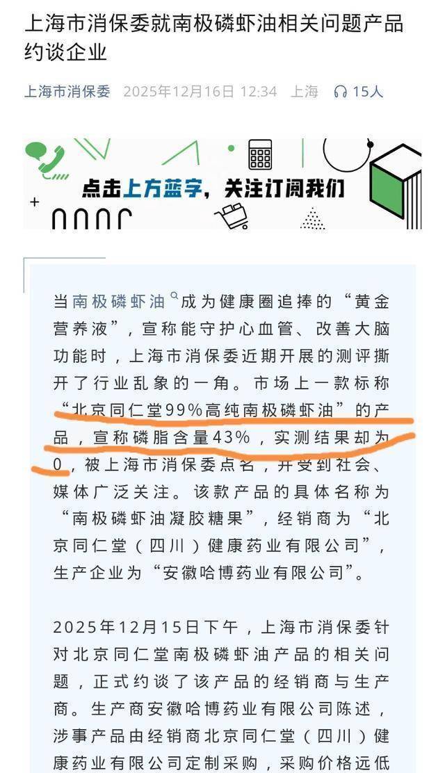 12月16日,上海市消保委微信公众号发布音问称,针对北京同仁堂南极磷虾油产物的干系问题,上海市消保委已于12月15日下昼约谈了该产物的经销商与坐蓐商。12月17日,山西晚报·江山+记者把稳到,部分电商平台上干系“同仁堂南极磷虾油”产物已下架。